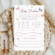 Adicione um toque divertido e interativo ao seu chá de bebê com este cartão de predição de bebê borboleta pastel! Com elegantes borboletas aquareladas e um design de confetes macios, os convidados podem adivinhar os detalhes do bebê, como nome, peso e data de chegada. Um lindo souvenir para guardar após a celebração!