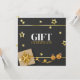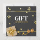 Design festivo glamouroso de alta qualidade, com caixa de presente de ouro de luxo, arco e fita com estrelas de ouro e bola de árvore de Natal sobre um simples fundo antracita de cinza escura. Esta elegante e moderna certidão de presente é perfeita para a sua pequena empresa ou para oferecer amigos e família, especialmente para as férias de Natal.
