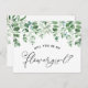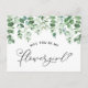 Peça aos seus amigos e familiares para fazerem parte do seu casamento com este cartão floral "Você Será Minha Dama de Flores?" com eucalipto em aquarela e caligrafia feminina. Itens correspondentes estão disponíveis. Cartão de Proposta para Cortejo da Noiva