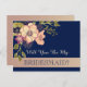 Cartão de proposta de damas de honra elegante e rústico em azul marinho, com belas flores em rose gold em aquarela.