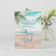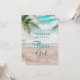 Cena de Praia Pintada Brisa da Ilha, com Ondas do Oceano, Praia Arenosa e Palmeiras, com um céu azul turquesa lindo. Com Fontes de Letra Moderna de Tipografia. Uma Praia Tropical de Verão, ou design de casamento de destino - Casamento Personalizado Você será minha Menina das Flores cartão de proposta!