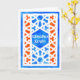 Um cartão de Ramadhan com um teste padrão islâmico tradicional da estrutura no branco em um fundo azul e alaranjado. O texto na placa central; está no branco e lê, "Ramadhan Kareem". Design pintado à mão nas aguarelas por Judy Adamson. O interior é deixado vazio para sua própria mensagem.