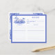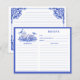 Este cartão contém um design monocromático com um conjunto de chá de chinoiserie azul e branco rodeado de flores e aves. As costas têm uma fronteira azul coordenada.