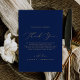 Este cartão de recepção de agradecimento dourado delicado e azul-marinho é perfeito para um casamento moderno. O design minimalista romântico apresenta uma tipografia amarela dourada champagne elegante e adorável em um fundo azul-marinho com uma aparência limpa e simples. Coloque esses cartões na mesa para cada um dos seus convidados na recepção do seu casamento. Personalize o cartão com seus nomes e uma mensagem especial de agradecimento.