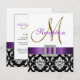 A elegância sofisticada é transmitida por este lindo design de convite de recepção de casamento. Um padrão floral damasco preto e branco serve como fundo para um efeito de foto da Inicial M em Dourado Metálico e uma fita de cetim roxa e broche de diamante TUDO IMPRESSO em um CARTÃO PLANO. Uma maneira perfeita de convidar seus convidados para a recepção de casamento. Padrão damasco contemporâneo, porém clássico, com um design que permite personalizar a frente com seus nomes ou a palavra "recepção" e o verso é livre para adicionar o texto personalizado do convite de recepção de casamento. O convite de recepção de casamento é definido para a inicial do monograma "M". Para outras letras ou cores de fita ou damasco, por favor, entre em contato com o designer em luxuryweddinginvitations@gmail.com. Design de Layout por Elke Clarke©. Gráficos licenciados. Além disso, escolha