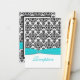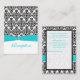 Este cartão de receptáculo de recepção de damasco preto e branco tem uma fita azul-aqua IMPRESSA e broche de joia de diamante IMPRESSO que seria perfeito para um casamento de aqua e temas negros. Alguns artigos irão alterar a cor do design, portanto, tenha cuidado se você escolher um dos tipos de papel além do branco básico mostrado aqui. ALÉM DISSO, se você redimensionar a placa, ou se você alterar fontes, ou o tamanho da fonte, parte do design e/ou texto poderá ser cortada. Tudo será impressão como você vê no seu monitor. Não verei o seu cartão, e Zazzle NÃO corrigirá nada (erros de digitação, alinhamento incorreto, etc.). O texto e o papel são todos personalizáveis. Se precisar de ajuda com este cartão, envie-me um e-mail ANTES de fazer seu pedido. Se você precisar de outros itens correspondentes, envie um e-mail para niteowlstudio@gmail.com