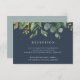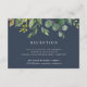 Projetado para combinar com nossa coleção de casamento Bosque de Eucalipto, este cartão de recepção botânico exuberante apresenta um spray de folhas em aquarela e folhagem verde de eucalipto, sobrepondo os detalhes da recepção, horário e endereço, em branco sobre um fundo azul-naval fumê.