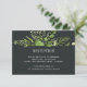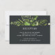 Projetado para combinar com nossa coleção de casamento Jardim da Meia-Noite, este cartão de recinto de recepção com um fresco tom botânico verde apresenta um spray de folhagem encimando os detalhes da recepção, horário, local e endereço em branco sobre um fundo escuro elegante.