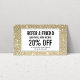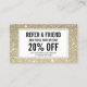Um cartão de referência de na moda e salão simples com um fundo de falso ouro brilhante. Atualize o texto de promoção para a oferta desejada. Gerar mais vendas e visitas, incentivando seus clientes a encaminhar seus amigos para um serviço ou produto gratuito com desconto. Excelente para salões de beleza, maquiadores, boutiques, cabeleireiros, cosmetólogos e muito mais. © 1201AM CREATIVE