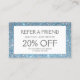 Um cartão de referência simples de salão e na moda, com um fundo falso de brilho prateado. Atualize o texto de promoção para a oferta desejada. Gerar mais vendas e visitas, incentivando seus clientes a encaminhar seus amigos para um serviço ou produto gratuito com desconto. Excelente para salões de beleza, maquiadores, boutiques, cabeleireiros, cosmetólogos e muito mais. © 1201AM CREATIVE