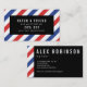 Um cartão de visita de padrão para um barbeiro com listras vermelhas e azuis em um fundo branco. De um lado, o design cobrir toda a área do cartão com um espaço para desconto ou oferta de referência no centro e do outro lado, há uma faixa estreita para baixo, deixando bastante espaço para seu nome e detalhes em texto branco sobre um fundo preto.
