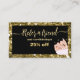 brilho preto e dourado com a mão da mulher Nail Salon Manicurist Modern Referral Card. Edite o nome do artista de unhas, desconto de referência, perfil social e número de telefone, etc.