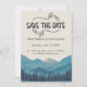 Anuncie o seu casamento na montanha com este cartão de reserva de data rústico com um design inspirado em um retiro cênico. Perfeito para casamentos ao ar livre, de aventura ou de destino nas montanhas. Totalmente personalizável com seus nomes e detalhes do casamento.