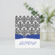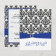 Este cartão de resposta em damasco preto e branco com uma fita "PRINTED ON" azul e broche de pedras preciosas combina com o convite de casamento mostrado abaixo. ****POR FAVOR, NOTE que este tamanho de cartão de resposta não caberá dentro do envelope do convite quadrado. Você DEVE usar o outro tamanho de cartão de RSVP encontrado vinculado ao convite quadrado (basta rolar a página do convite quadrado). Se você precisar de outros itens correspondentes ou gostaria de outra combinação de cores, por favor, envie um e-mail para niteowlstudio@gmail.com com sua solicitação.