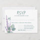 Cartões de resposta de casamento Eucalipto e lavanda com espaço para uma lista de opções de menu para convidados. Personalize conforme necessário com o texto verde da cinza em fontes modernas. Uma lavanda de com folhas de eucalipto é a design impressa no canto inferior esquerdo em placas brancas. O reverso é verde-claro sólido.