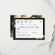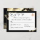 Design apresenta um fundo preto elegante com rosas de sepia ao redor de um retângulo branco mostrando texto. O texto é exibido no formato adequado para um cartão de resposta. O verso exibe uma grande imagem de um belo rosa de sépia contra um fundo preto. Uma cruz de ouro entrelaçada com dois anéis de casamento é apresentada no canto superior direito. Design é muito agradável para o olho.