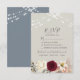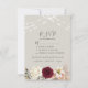 Cartão de resposta de casamento floral rústico e boho elegante com lindas flores de água burgundy, luzes de corda e caligrafia moderna.