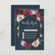 Moderno, Elegante, Burgundy Marsala Navy e Peach Floral Aquarela | Cartão de resposta de casamento com moldura geométrica. Rosas pintadas em aquarela burgundy, marsala, navy, arranjo floral botânico cor-de-rosa com folhas verdes em fundo azul navy. Apresenta um design de tipografia manuscrita elegante com o texto "Kindly Reply". Ótima escolha para casamentos de outono, inverno ou qualquer estação. #3339 Se precisar de ajuda ou itens correspondentes, por favor entre em contato.