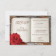 Um cartão de resposta de casamento romântico com um livro e uma rosa vermelha sobre um fundo de parede de tijolos. Este cartão de resposta faz parte de uma coleção de casamento com um tema de biblioteca ou amantes de livros.