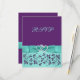 Este cartão de resposta de casamento floral roxo e azul aqua romântico e elegante tem uma fita e laço IMPRESSOS com um par de joias de diamante IMPRESSAS e corações unidos com brilho FALSO (simulado), com uma borda ornamentada no verso que combina com o convite de casamento mostrado abaixo. ***POR FAVOR, NOTE que não há elementos em relevo neste convite. Tudo é impresso plano. É mostrado aqui em papel básico, mas para um toque extra de elegância, sugiro o papel metálico gelo se o seu orçamento permitir, pois tem uma linda opalescência sutil que realmente destaca o convite. NÃO usaria nenhum dos papéis coloridos (champanhe, dourado, prata, delicado, sulcado, manchado), pois TODOS alterarão as cores do design (os brancos dos diamantes deixarão de ser brancos). O papel linho adicionará uma textura de linhas finas que você pode não querer, e é um papel mais leve. Os papéis básicos ou reciclados são uma alternativa mais barata se você estiver com um orçamento mais apertado. ***POR FAVOR, NOTE que se você alterar as fontes ou o tamanho das fontes, isso pode alterar a forma como seu convite é impresso. Ele será impresso da forma como você vê na tela, então se você tiver problemas de alinhamento ou tamanho, por favor entre em contato comigo para obter ajuda. Não verei seu convite uma vez que você o encomendar, e a Zazzle NÃO editará ou corrigirá nada (er