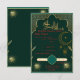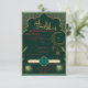 Complete o seu conjunto de papelaria de casamento islâmico com este cartão de RSVP elegante verde e dourado. Com um luxuoso fundo esmeralda e detalhes intricados em arabesco dourado, este cartão de resposta complementa lindamente o seu convite de Nikah ou Walima.