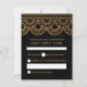 Este cartão de resposta de deco de arte preto e dourado mantém o olhar escuro e romântico da suíte com caixas brancas para os convidados escreverem suas informações. Os escalões de brilho dourado falsos varrem a parte superior da placa e apresentam um backer correspondente do mesmo padrão para amarrar toda a suíte.