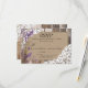 Design de cartão de resposta para casamento country western rústico com flores de lavanda e renda branca sobre fundo de linho e tábuas de madeira envelhecida.