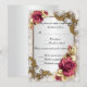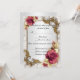 Lindas rosas vermelhas e moldura com padrão de folha de ouro. Este belo cartão de RSVP/resposta de casamento está pronto para ser personalizado para o seu dia especial de casamento. Personalize o cartão alterando o texto nos campos fornecidos na frente e no verso. Você pode alterar o estilo, tamanho e cor da fonte, bem como o tipo e estilo de papel.