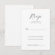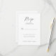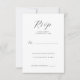 Este cartão de resposta de casamento elegante apresenta um design minimalista com amplo espaço em branco, criando uma aparência limpa e sofisticada. O layout inclui um "RSVP" cursivo proeminente no topo, seguido por uma fonte serifada formal para as instruções de resposta. As opções de personalização são integradas perfeitamente, permitindo que um nome e número de convidados sejam adicionados. A paleta de cores restrita de cinza escuro ou preto em branco crocante realça seu estilo clássico, tornando-o perfeito para transmitir refinamento e simplicidade no seu evento especial.