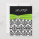 Este cartão de RSVP em damasco preto e branco com uma fita impressa verde lima e broche de pedras preciosas combina com o convite de casamento mostrado abaixo. Se você precisar de outros itens correspondentes ou quiser em outra combinação de cores, envie um e-mail para niteowlstudio@gmail.com com sua solicitação.