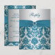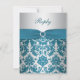 Este elegante cartão de RSVP de casamento em damasco cinza prateado e azul-turquesa tem uma fita com aparência de cetim IMPRIMIDA e uma fivela de diamantes IMPRIMIDOS que combina com o convite de casamento mostrado abaixo. O texto e o tipo de papel são personalizáveis. Alguns dos papéis podem alterar a cor do design. Eu NÃO usaria os papéis metálicos dourado, champanhe ou prata, pois eles escurecerão o design e descolorirão o branco dos diamantes sem adicionar nenhum brilho extra além do que você obteria com o papel metálico gelo. O papel feltro também descolorirá o design. ALÉM DISSO, se você redimensionar o convite, ou se você mudar as fontes, ou o tamanho da fonte, parte do design e/ou texto pode ser cortado. Tudo será impresso como você vê no seu monitor. Eu não verei seu convite, e a Zazzle NÃO irá corrigir nada (erros de digitação, desalinhamento, etc.). Se você precisar de ajuda com este convite, por favor me envie um e-mail ANTES de fazer o seu pedido. Se você precisar de itens correspondentes, ou se você gostaria de