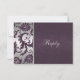 Este cartão de resposta em damasco floral roxo lápis e cinza prateado moderno combina com os convites de casamento mostrados abaixo. É totalmente personalizável, incluindo o tipo de papel. ****POR FAVOR, NOTE que não há chanfradura ou relevo neste convite (ou em qualquer um da Zazzle). É um design plano e liso. ALÉM DISSO, não sugiro mudar o papel para o metálico prateado, pois é um papel muito escuro. Se precisar de ajuda para personalizar este produto com o seu próprio texto, ou se precisar de algum item correspondente neste design, por favor envie um email para niteowlstudio@gmail.com. Os itens correspondentes são mostrados abaixo.
