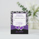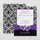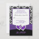 Este cartão de RSVP damasco preto e branco tem uma fita roxa IMPRIMIDA e corações de diamantes unidos com brilho IMPRIMIDOS que combinam com o convite de casamento mostrado abaixo. Se você precisar de outros itens correspondentes ou gostaria de ter em outra combinação de cores, envie um e-mail para niteowlstudio@gmail.com com sua solicitação.