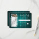 Cartão de RSVP de casamento azul-cinzento rústico com uma jarra de pedreiro e dois corações de aniagem com iniciais contra um fundo de madeira rústica. Personalize facilmente este lindo cartão de RSVP azul-cinzento rústico online.