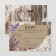 Design de cartão de RSVP de casamento country western rústico com flores de lavanda e renda branca sobre fundo de linho e tábuas de madeira envelhecida
