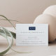Elegantes, sofisticados e modernos, esses cartões de resposta de casamento ultra modernos apresentam "RSVP" definido em um elemento retangular que pode ser personalizado com o clique de um botão para combinar com as cores do seu casamento. Adicione a data de RSVP desejada, aceitação e declínio, e preferências de refeição ou entrada em letras sans serif modernas em cinza carvão, e ajuste a cor de acordo com sua preferência usando as instruções fáceis abaixo. Os cartões têm o verso com um padrão opcional de chave grega moderna. Mostrado em azul clássico e branco.