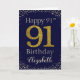 Feliz aniversário com simulação de brilho de ouro número 91 em uma cor sólida e emoldurado por diamantes falsos e rochas. Feliz aniversário e nome de destinatários em fonte não branca. Personalizar com nome ou mensagem.