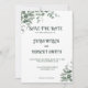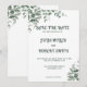 Um belo cartão de "Salve a Data" em um design simples e elegante decorado com folhas de Eucalipto.