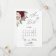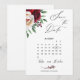 Cartão de salvar a data de casamento com floral burgundy e verde, pequenos desenhos e nomes em caligrafia.