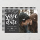 Cartão de salvar a data com tema de inverno com sua foto personalizada e flocos de neve prateados brilhantes. O texto diz "salve nossa data" em letra de pincel com o nome do casal, data do casamento e cidade e estado onde o casamento acontecerá. Todos os textos são editáveis. Prata e cinza carvão. O verso do cartão é xadrez cinza.