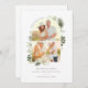 Este cartão de salvar a data com várias fotos é perfeito para um casamento na praia! Com três fotos em um formato de arco único acentuado com folhagens tropicais e folhas de palmeira, seus convidados certamente estarão ansiosos para o seu casamento de destino. Espaço extra no verso para o site do seu casamento ou detalhes adicionais.