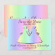 Duas noivas de mãos dadas neste cartão pré-convite colorido para um casamento lésbico. A aparência delas e o fundo são o arco-íris do Orgulho Gay em tons pastel. Alerte sua família e amigos para que possam desocupar suas agendas para o grande dia.
