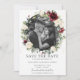 Destaque sua foto pré-casamento com este cartão de salvar a data de foto boho chic. Apresentando uma bela grinalda de flores marfim e folhagem verde em aquarela borgonha. Personalize-o com seus detalhes de forma fácil e rápida, basta pressionar o botão personalizar para reorganizar e formatar o estilo e a colocação do texto.