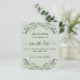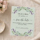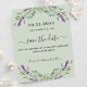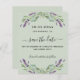 Um cartão de Salvar a Data moderno e elegante para um casamento. Um fundo verde salgueiro decorado com flores de lavanda e folhagens de eucalipto. Personalize e adicione uma data e seus nomes. O texto: Salve a Data é escrito com um estilo de letra manuscrita trendy grande.