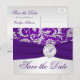 Este cartão postal de salvar a data em damasco roxo e prata monogramado com fita FAUX e broche de jóias combina com o convite de casamento mostrado abaixo. Se você precisar de outros itens correspondentes neste design, por favor envie um e-mail para niteowlstudio@gmail.com com sua solicitação.