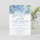 Cartão de anúncio de salvar a data de casamento floral em aquarela com hortênsias azul pervinca. Personalize nomes, datas e informações.