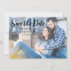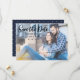 Cartão de Salvar Data Horizontal. Este design tem uma aparência e sensação casuais. No verso, há um fundo azul escuro com pontos dourados.