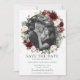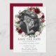 Destaque sua foto pré-casamento com este cartão de salvar data com foto boho chic. Apresentando uma bela água-forte borgonha, rosa suave, floral rosa pálido e coroa de folhagem verde. Personalize-o com seus detalhes de forma fácil e rápida, basta pressionar o botão personalizar para reorganizar e formatar o estilo e a colocação do texto.