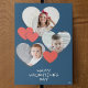 Cartão de saudação de colagem de fotos dobrado, elegante, com seis formas cardíacas sobrepostas, três com fotos personalizáveis. Cabeçalho de texto aberto - personalize o espaço reservado para ajustado do evento (por exemplo, "Avô Feliz dia de os namorados"). Perfeito para Dia de os namorados, Dia Mais Doce, Dia de as mães, Dia de os pais, Aniversário, ou sempre que quiser compartilhar seu amor, alegria e algumas fotos simples. stub de mensagem pessoal. Disponível numa seleção curada de cores de fundo ousadas e modernas. Também disponível como uma placa simples.