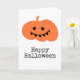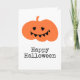 Cartão de Dia das Bruxas Bonito com uma abóbora cor de laranja feliz. A design minimalista é um belo fazer, a abóbora, o ponto de foco junto com o texto que lê Feliz Halloween. Você pode personalizar o texto e as cores. Ilustrada e projetada por Patricia Alvarez.